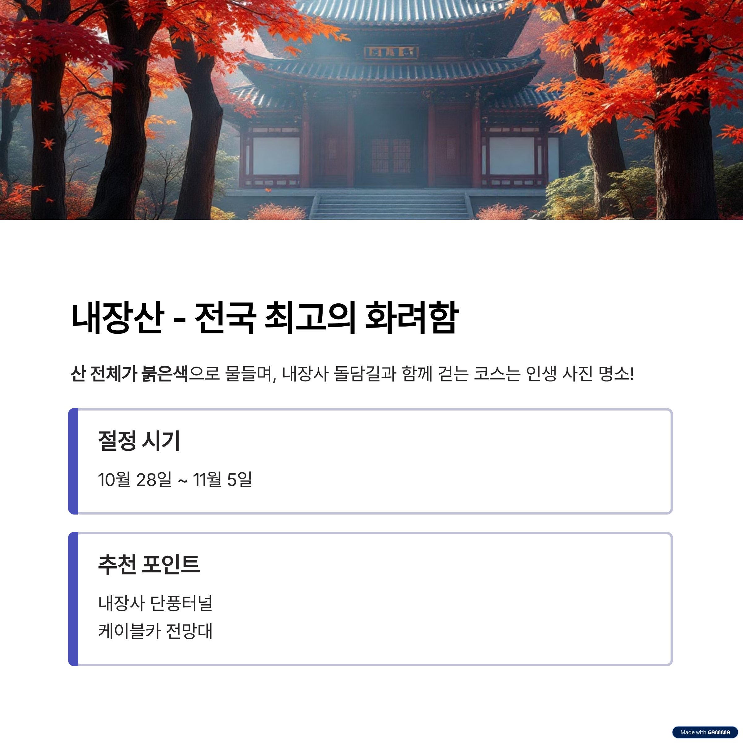 추천 포인트: 내장사 단풍터널, 케이블카 전망대