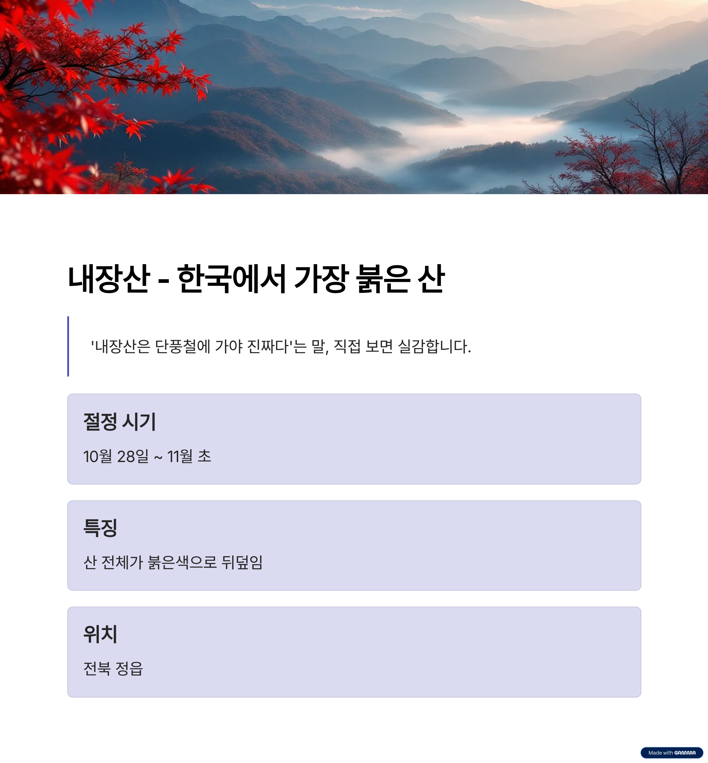 | 단풍이 절정일 때 꼭 가야 할 국내 명소 BEST 7 (0) | 2025.09.10 |