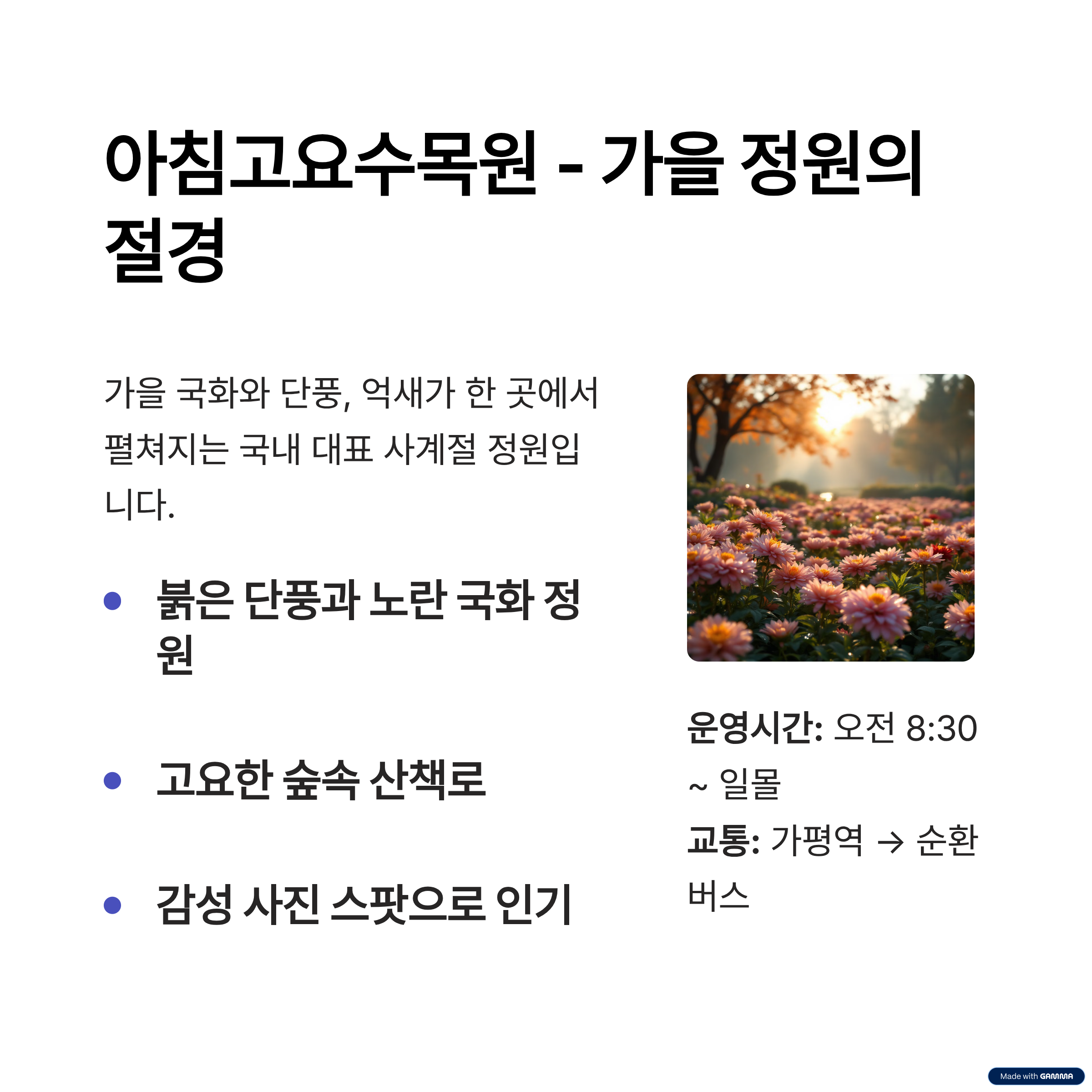 가을 포인트: 단풍+국화 정원, 고요한 숲 산책