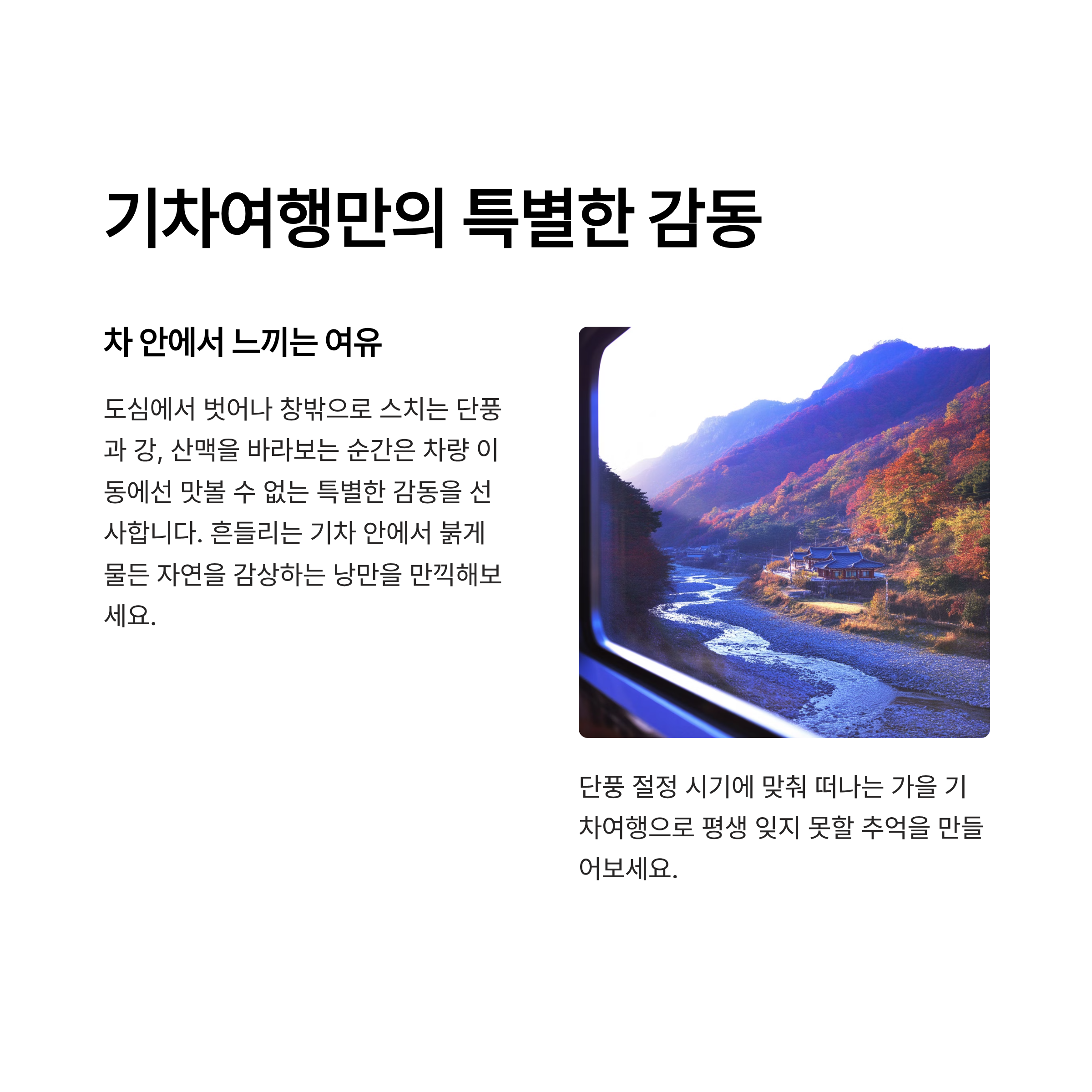 짧은 가을, 단 한 번의 여행으로도 평생 기억될 장면을 만들고 싶다면, 올가을 단풍 기차여행이 그 해답이 될 것이다.