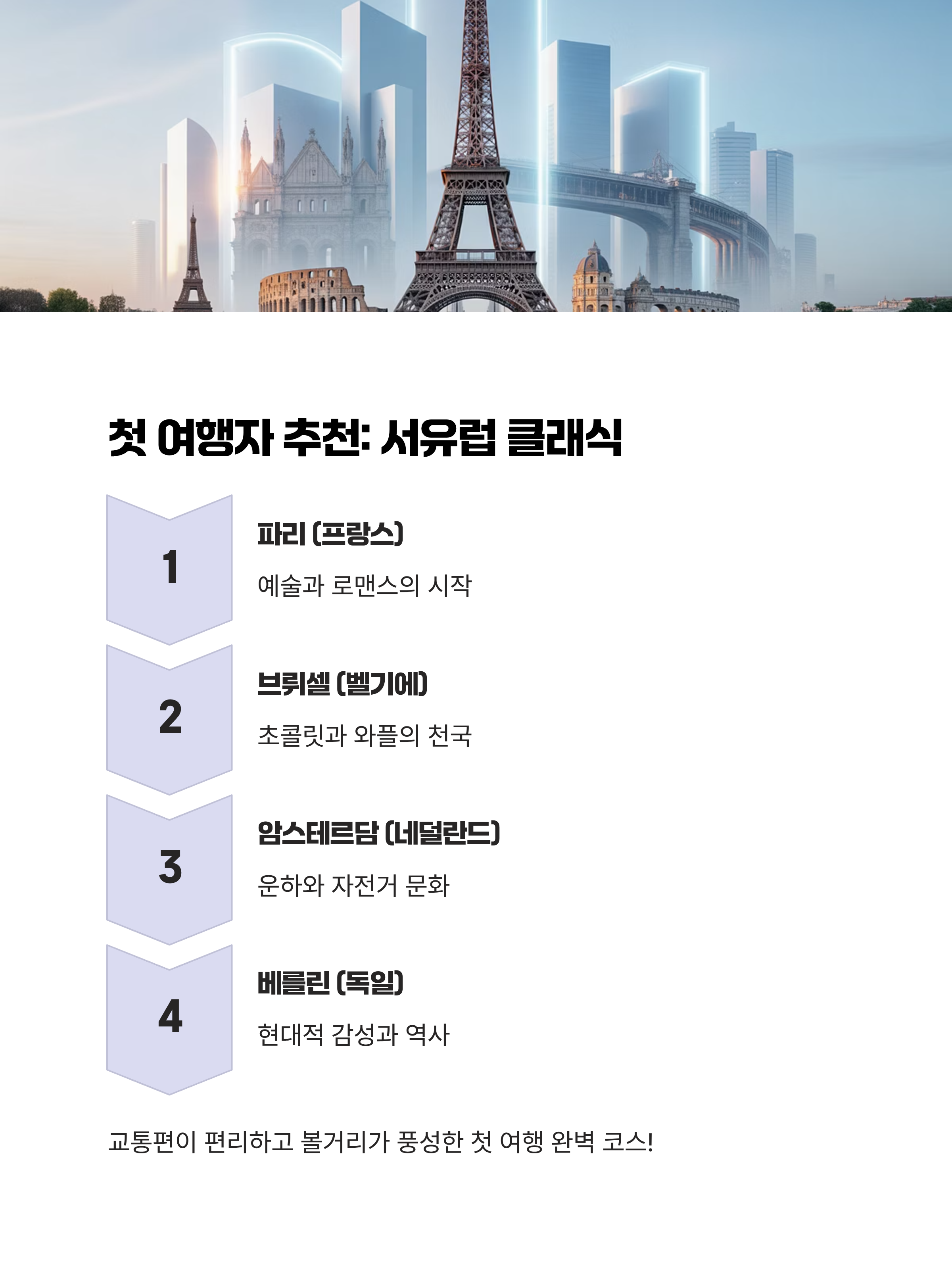 • 하이라이트: 파리 에펠탑 야경, 브뤼셀 그랑플라스, 암스테르담 운하 자전거 여행, 베를린의 현대적 감성