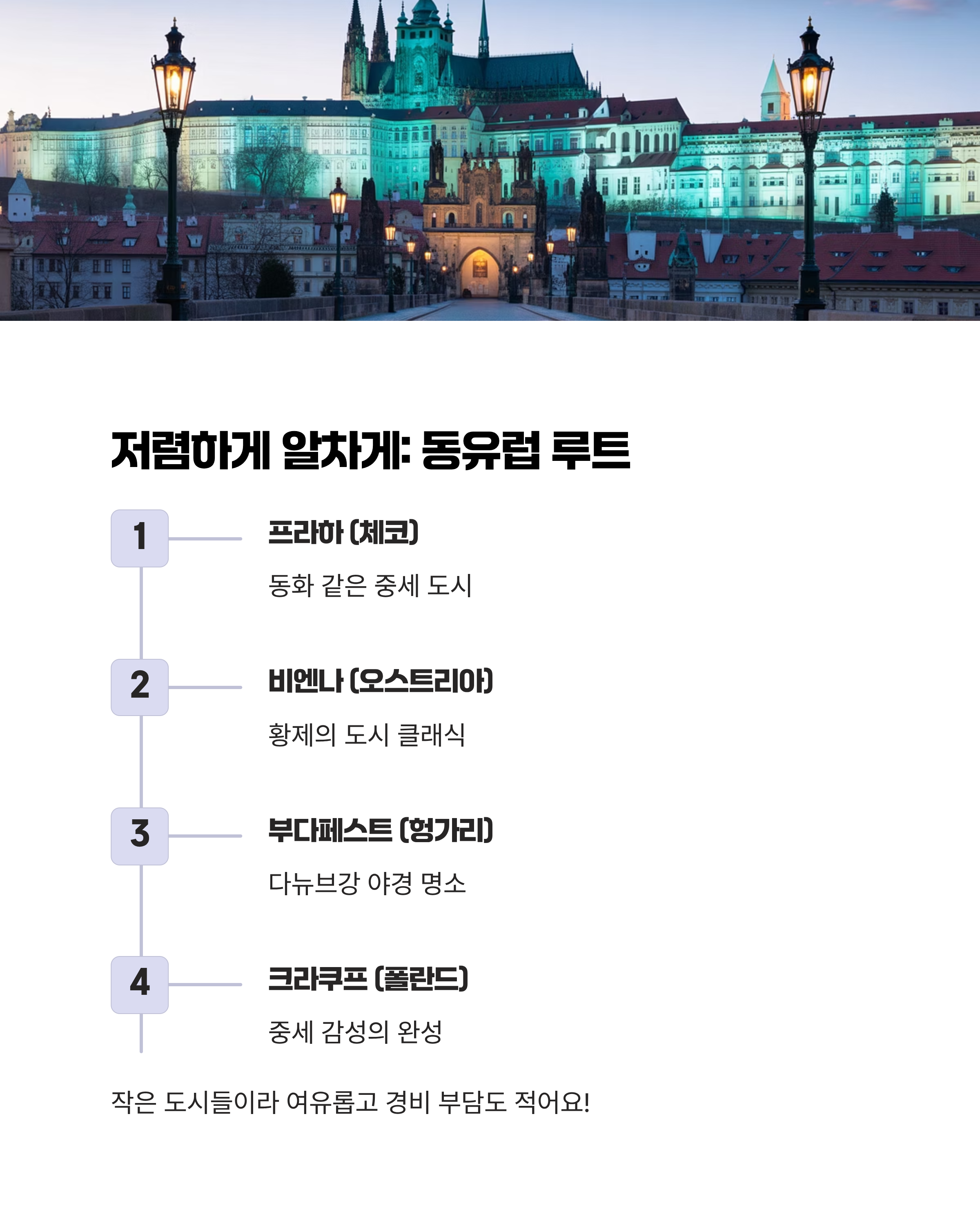 • 루트 예시: 프라하(체코) → 비엔나(오스트리아) → 부다페스트(헝가리) → 크라쿠프(폴란드)