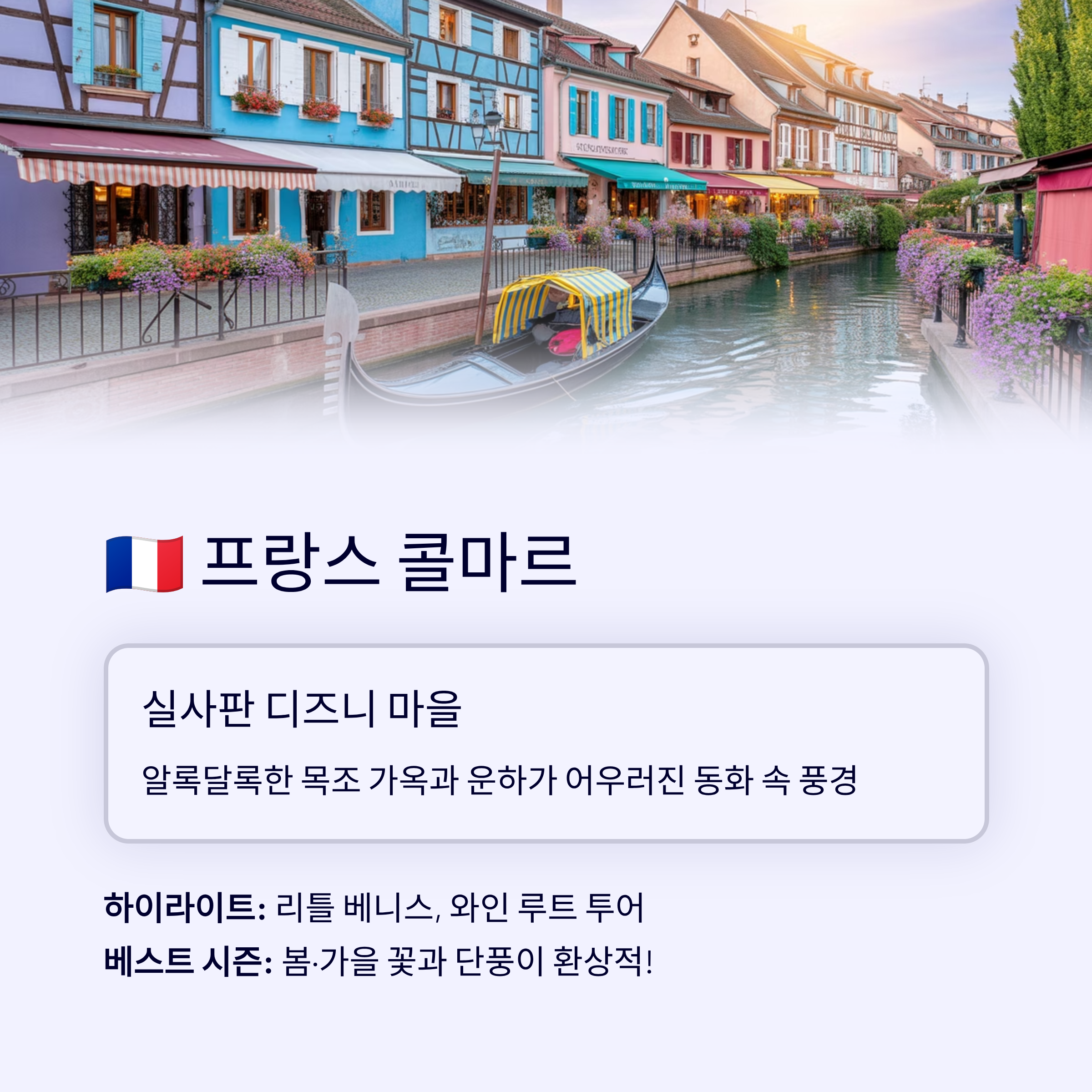- 매력: 알자스 지방의 동화 같은 마을, 알록달록한 목조 가옥과 운하가 어우러져 ‘실사판 디즈니’라 불립니다.