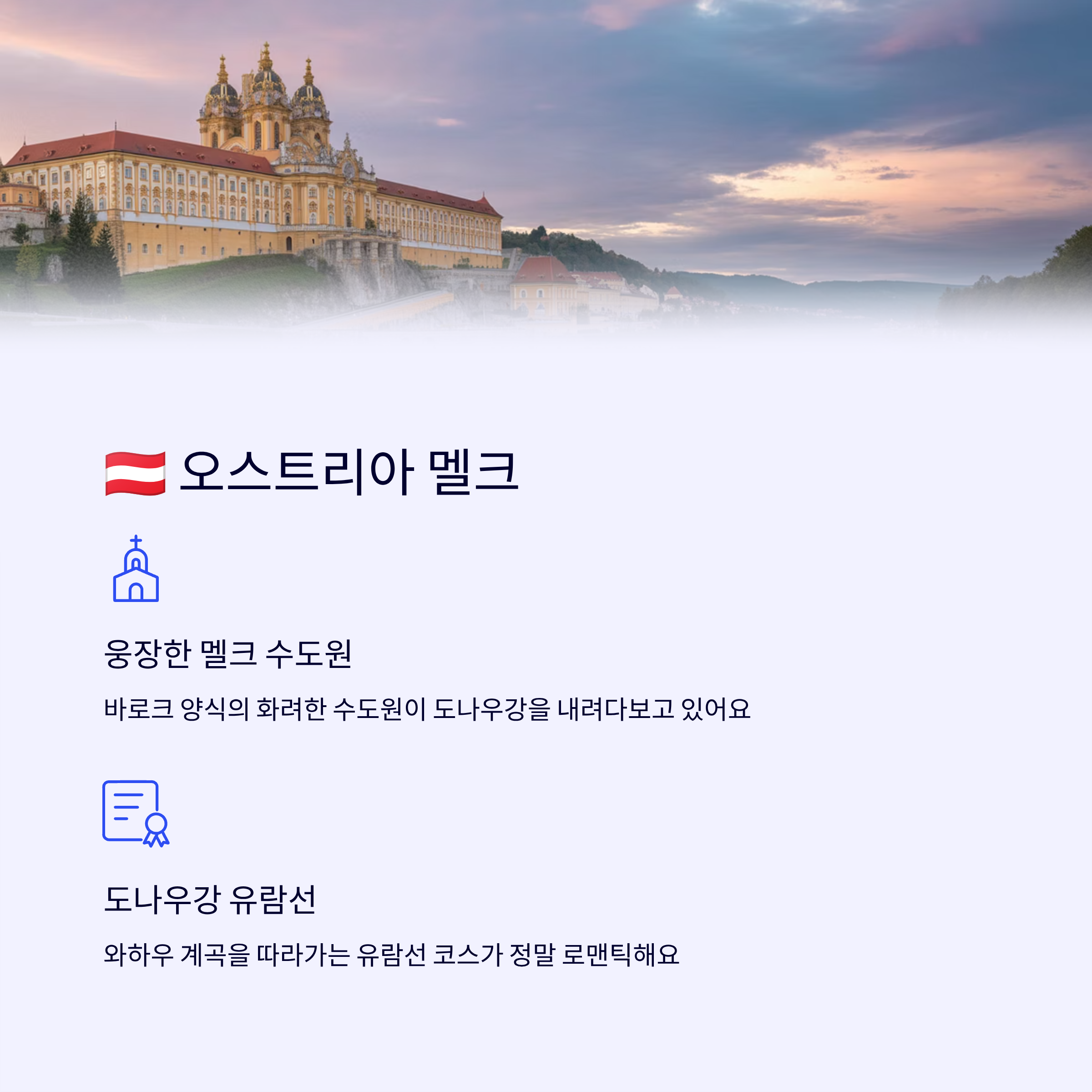 - 매력: 도나우 강변의 작은 도시. 웅장한 멜크 수도원과 와하우 계곡 유람선 코스로 유명.