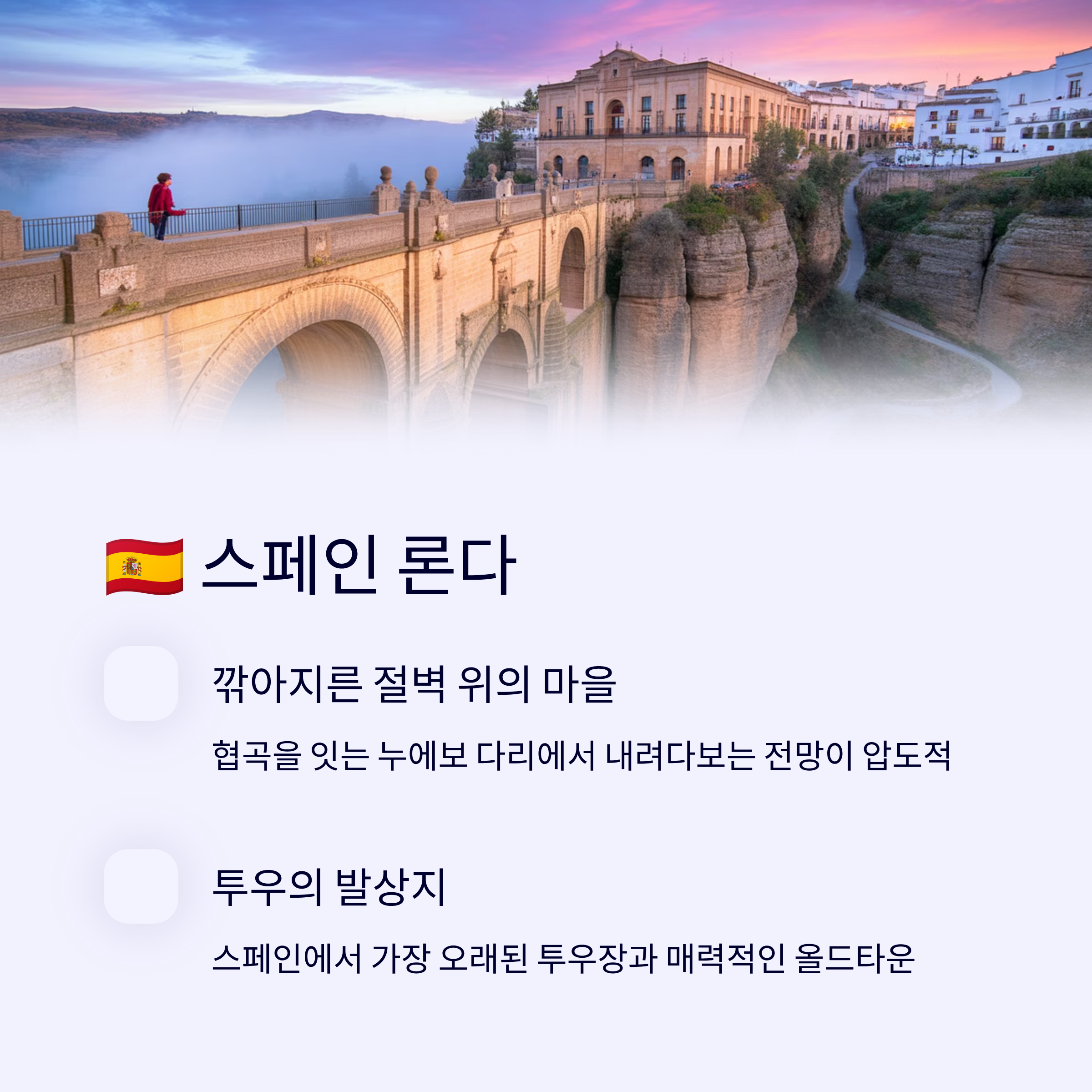 - 매력: 절벽 위에 세워진 도시로, 깊은 협곡을 가로지르는 누에보 다리가 상징적.