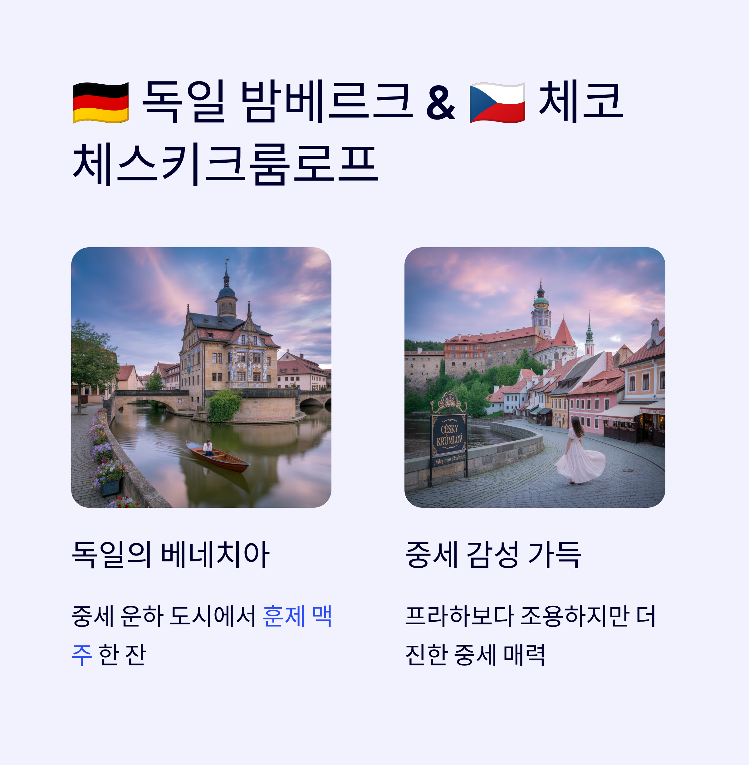 - 하이라이트: 크룸로프 성, 블타바 강변 카페, 저녁의 성 야경.