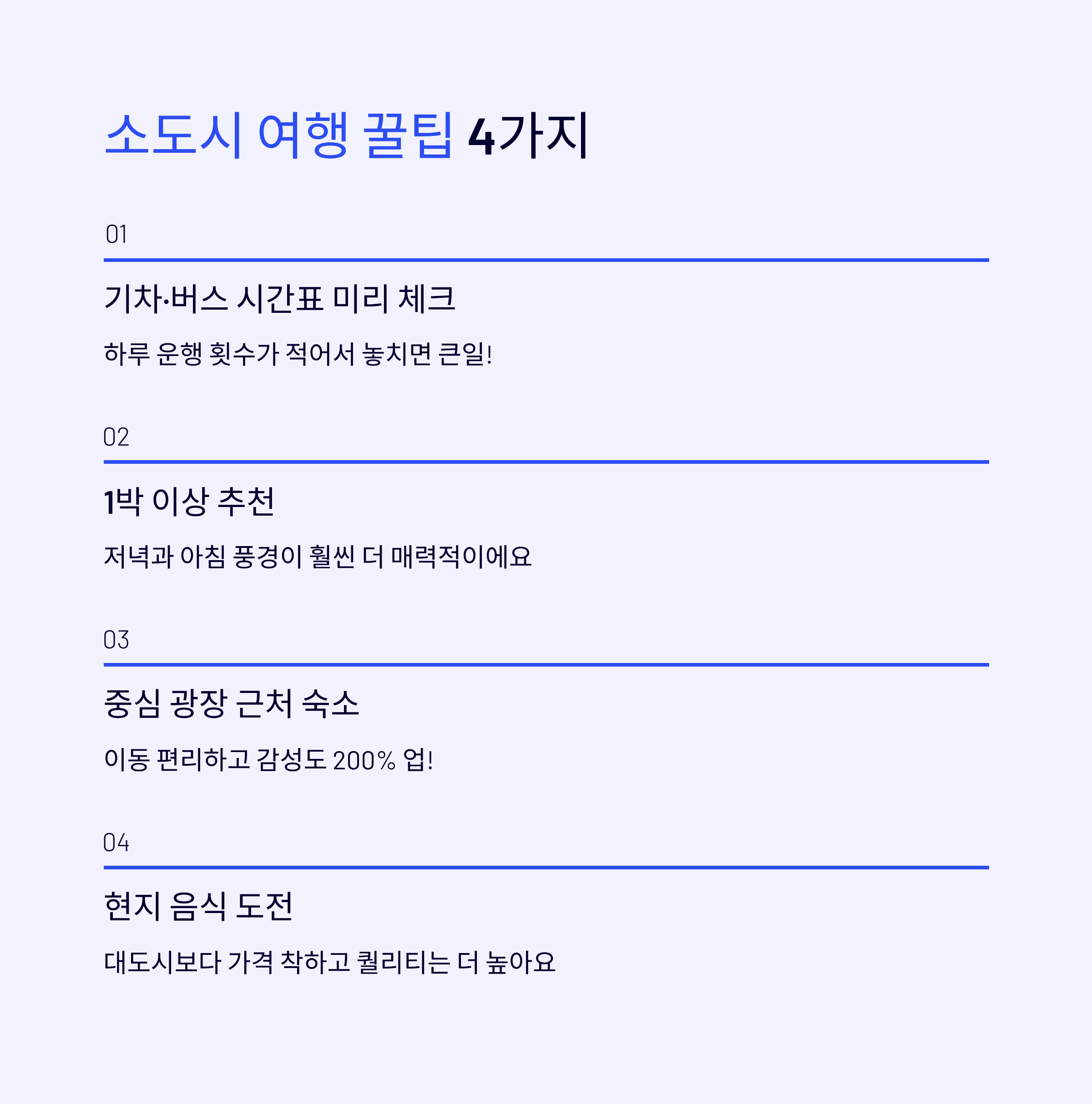• 교통 확인 필수: 하루 기차·버스 횟수가 적어, 시간표를 반드시 미리 확인해야 합니다.