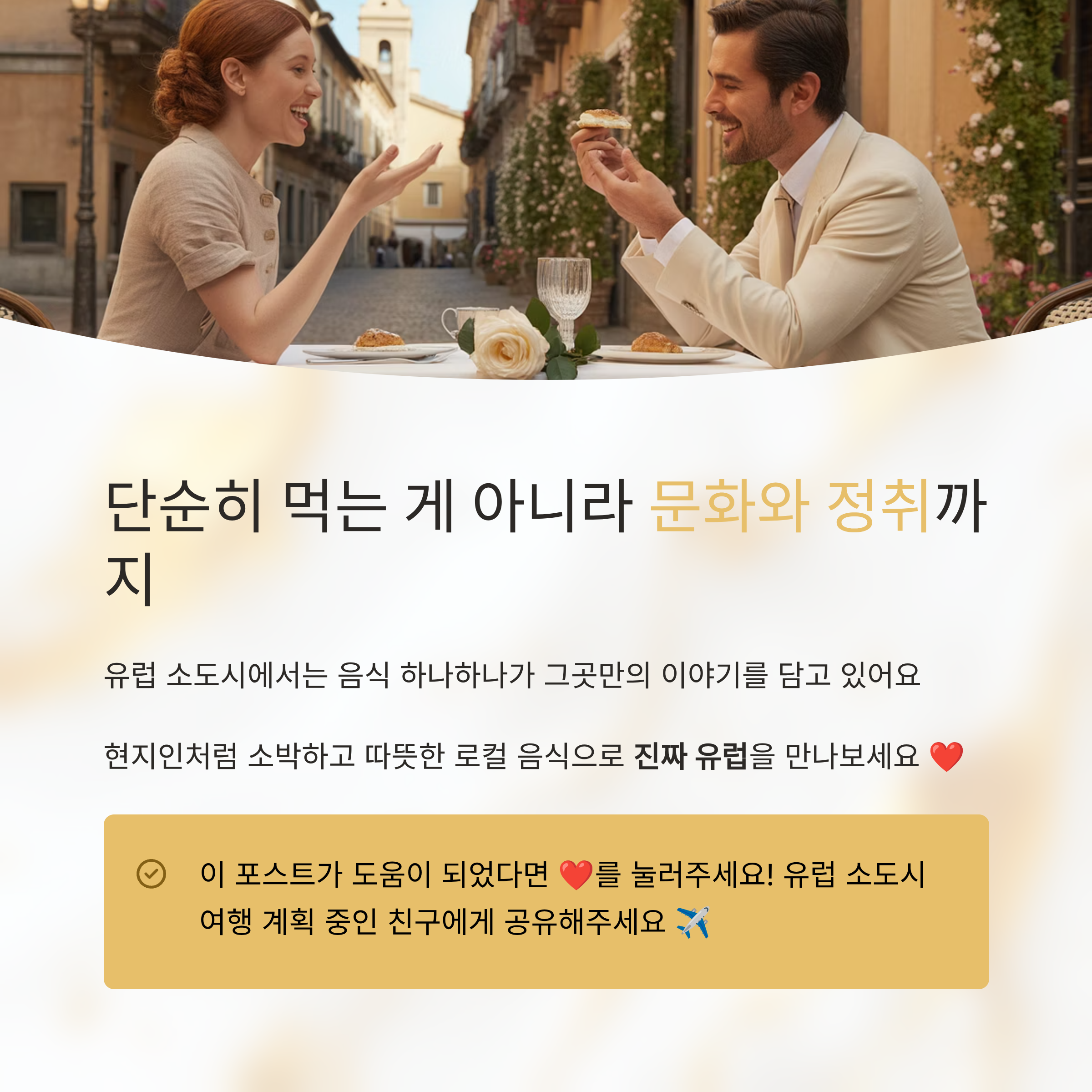 유럽 소도시 여행의 묘미는 단순히 경치를 보는 것이 아닙니다. 그곳만의 음식은 지역 문화와 역사, 사람들의 삶을 고스란히 담고 있습니다.