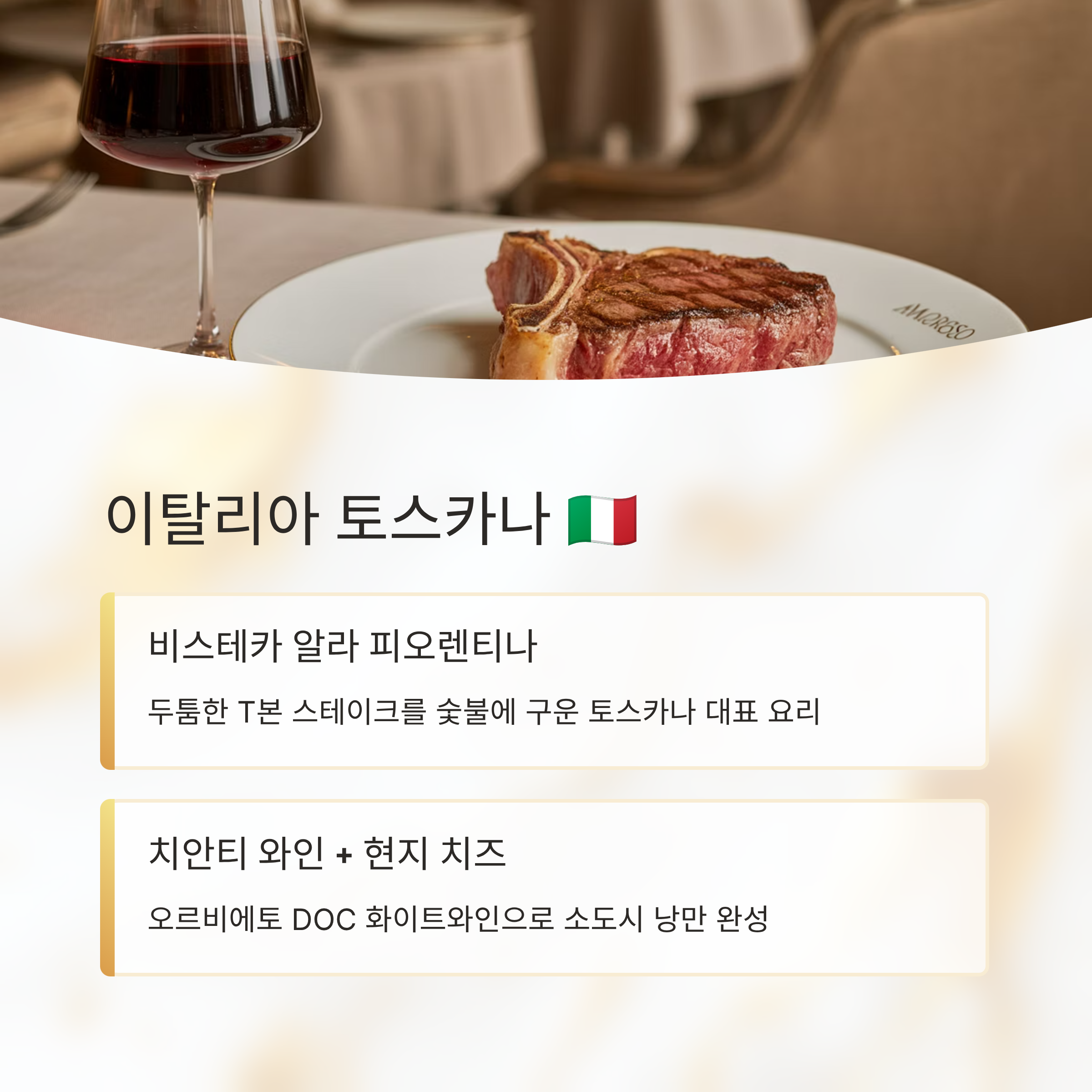 | 이탈리아 | 오르비에토/토스카나 | 비스테카 알라 피오렌티나, 와인 |
