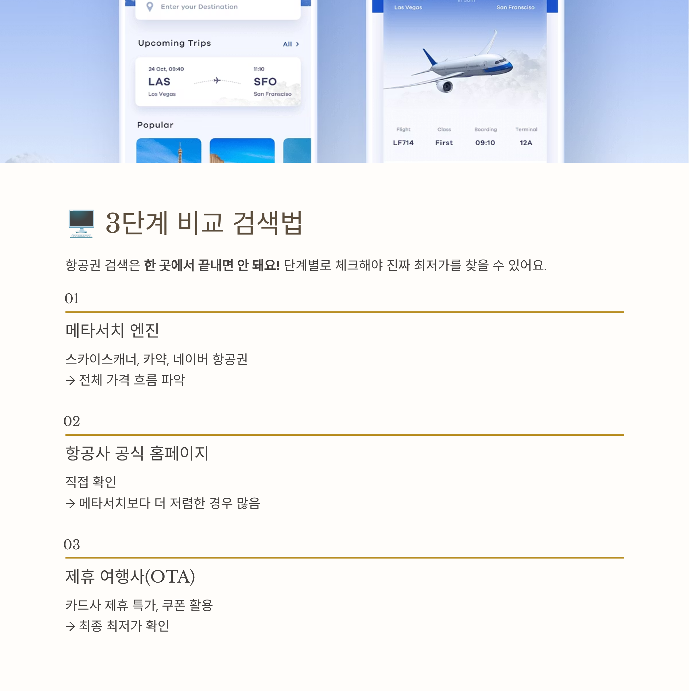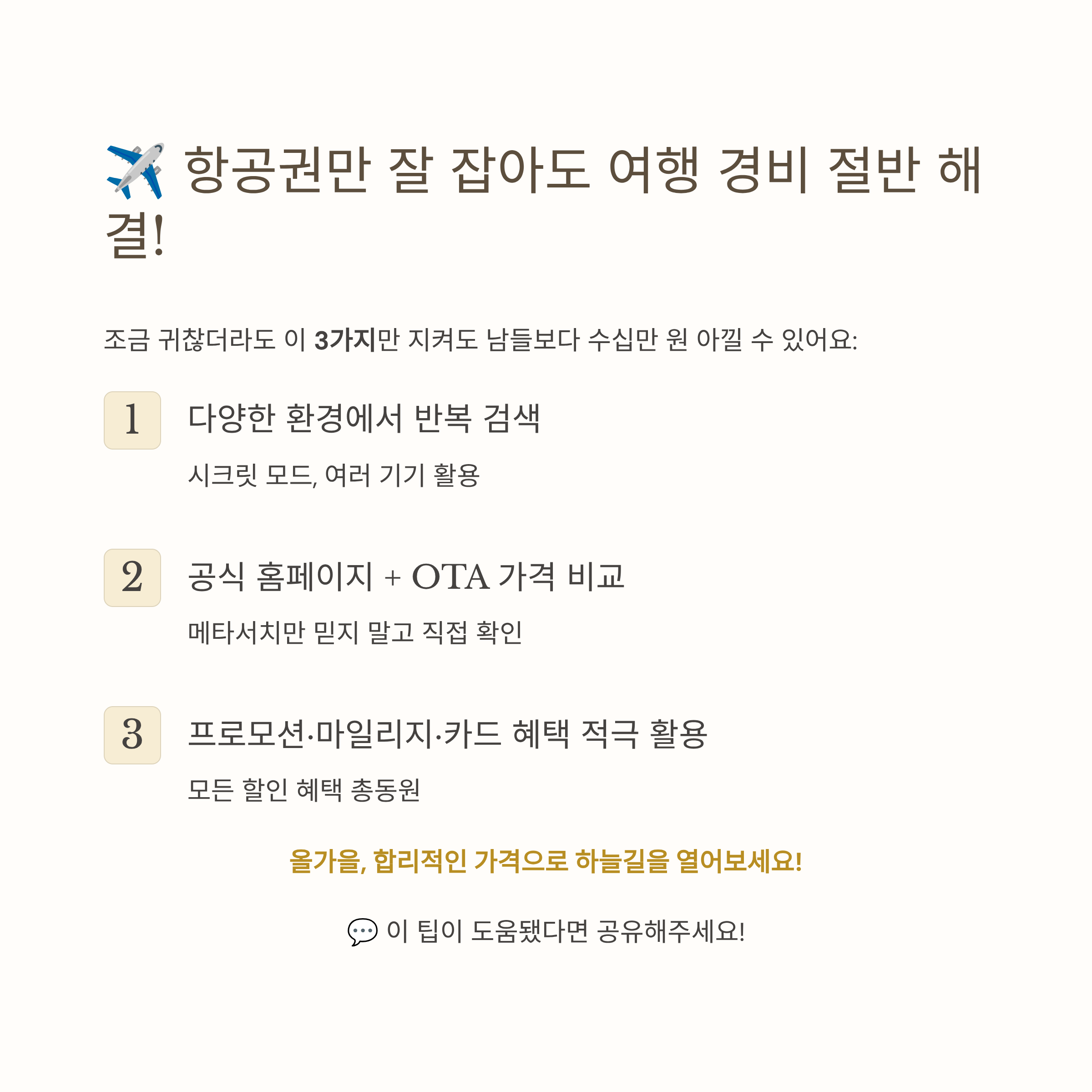 - 할인 코드: LCC와 OTA는 종종 한정 쿠폰 발행 (네이버페이, 카카오페이 결제 시 추가 할인)