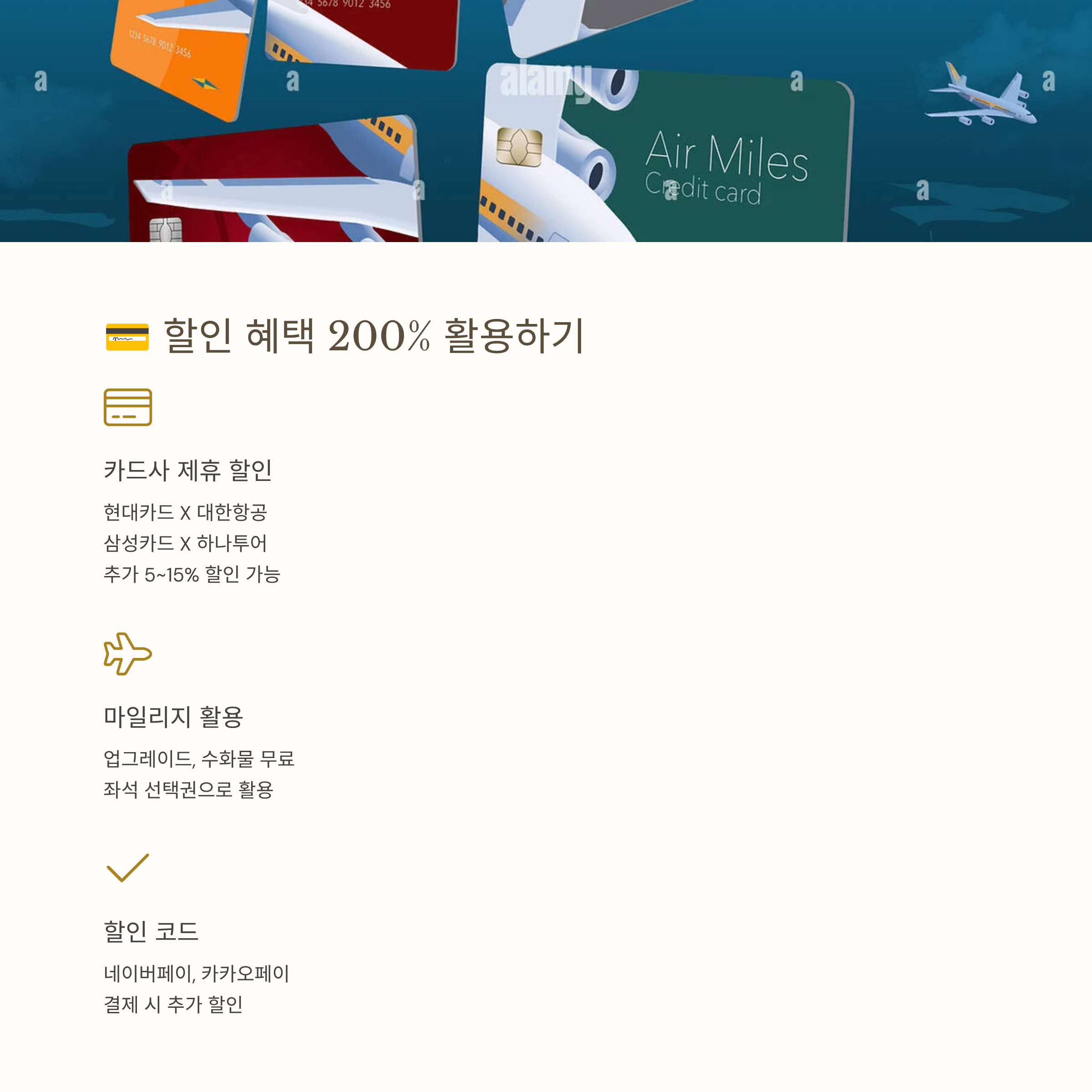 - 카드사 제휴 할인: 현대카드 X 대한항공, 삼성카드 X 하나투어