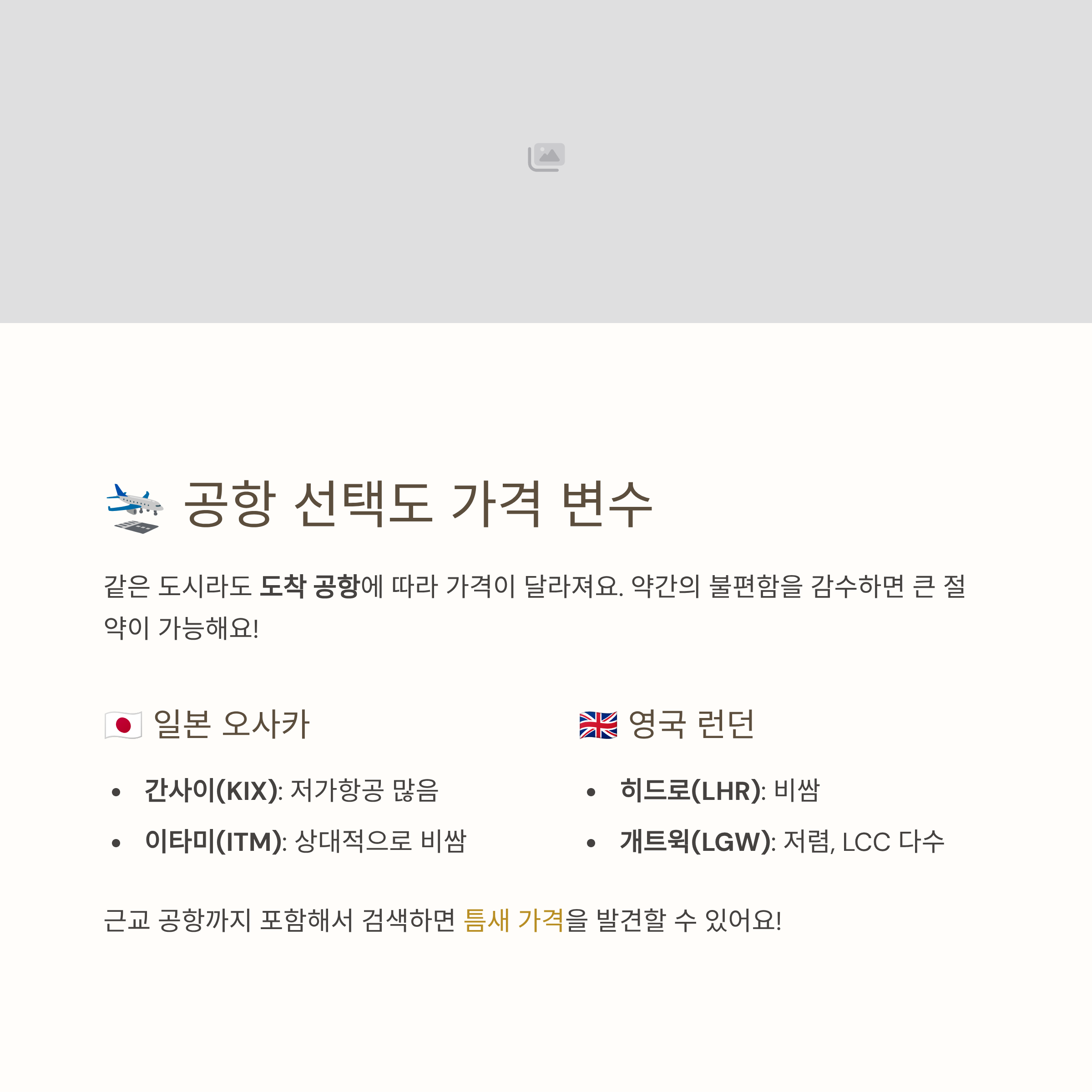 - 비수기(1월, 11월): 출발 1개월 전에도 저렴한 표가 풀리므로 ‘기다리기 전략’ 가능