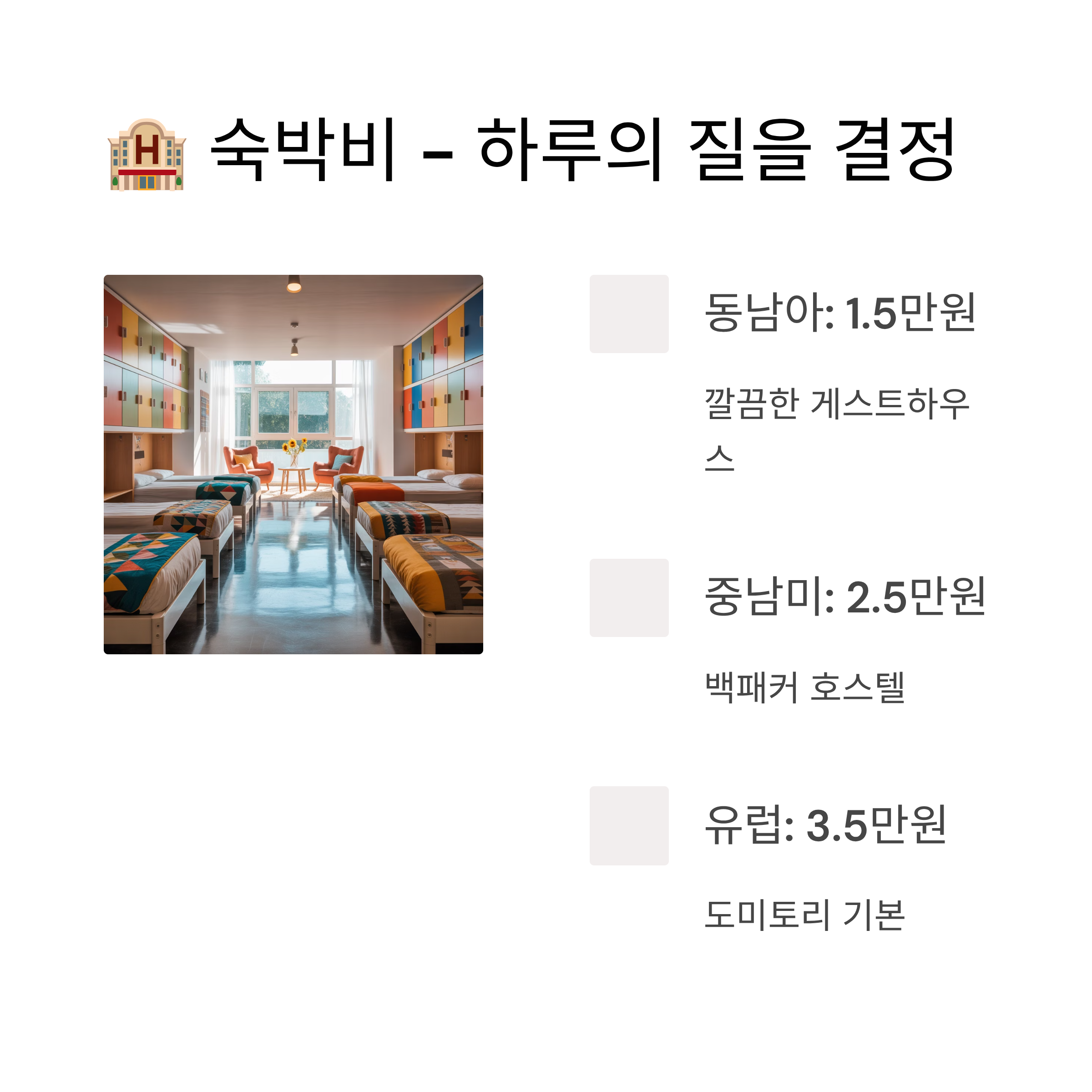 • 동남아: 하루 1~2만 원이면 깔끔한 도미토리나 개인실에서 숙박 가능합니다.